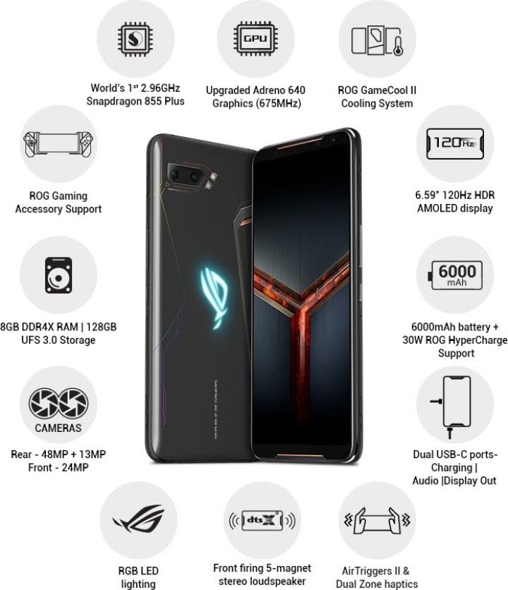 Asus ROG Phone 2 The phone comes with a 6.59-inch touchscreen display with a resolution of 1080×2340 pixels and an aspect ratio of 19.5:9. Asus ROG Phone 2 is powered by a 2.6GHz octa-core processor. It comes with 8GB of RAM. The Asus ROG Phone 2 runs Android 9 Pie and is powered by a 6000mAh non-removable battery